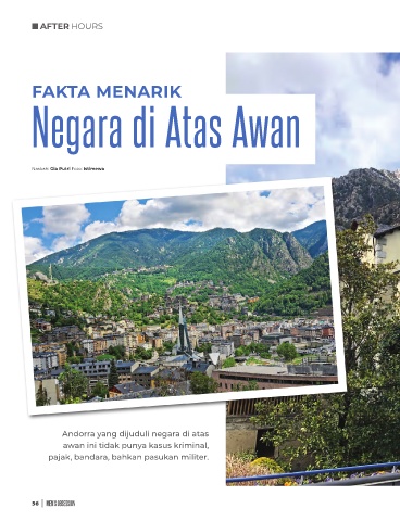 ■ AFTER HOURS FAKTA MENARIK Negara di Atas Awan Naskah: Gia Putri Foto: Istimewa Andorra yang dijuduli negara di atas awan ini tidak punya kasus kriminal, pajak, bandara, bahkan pasukan militer. 56 |